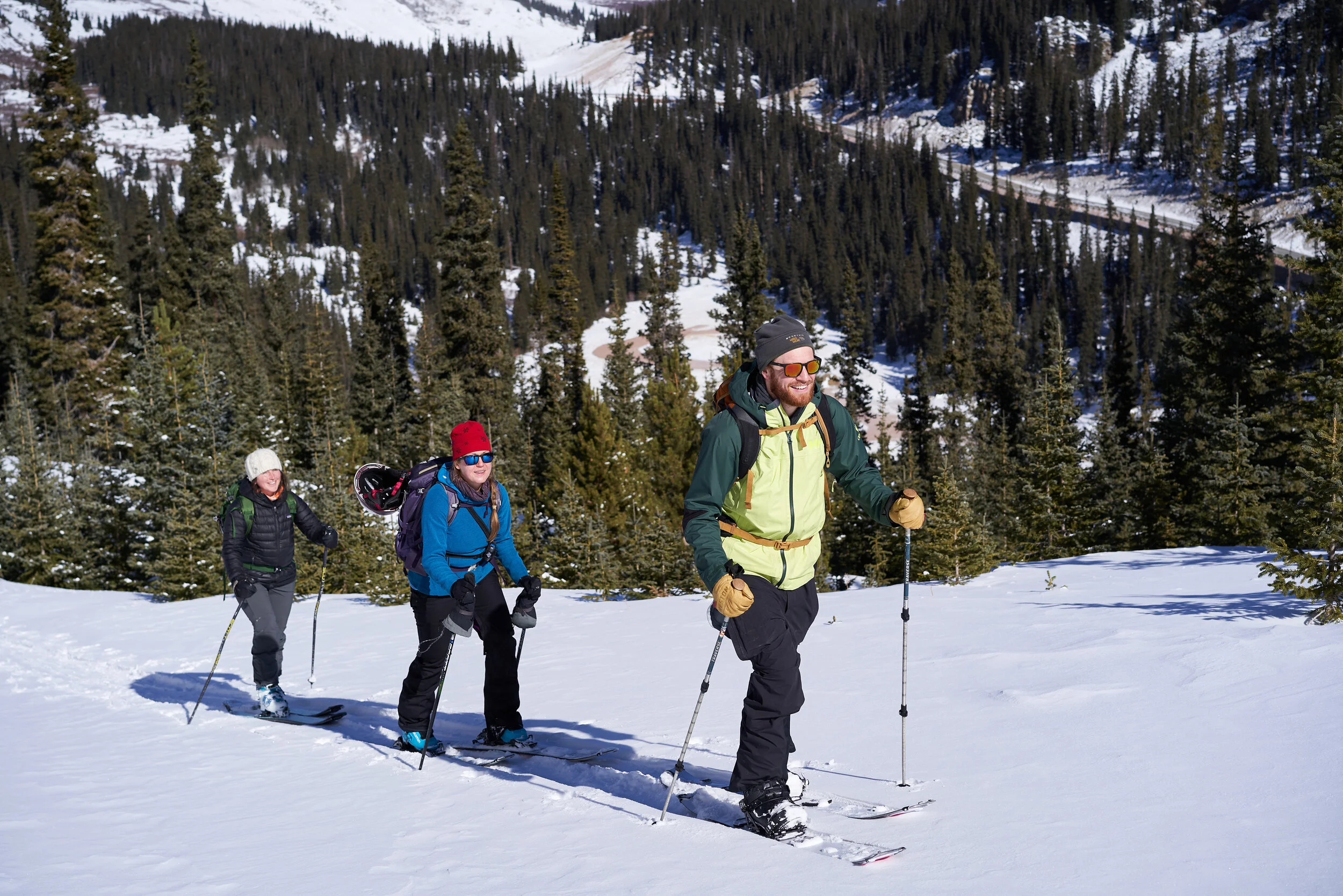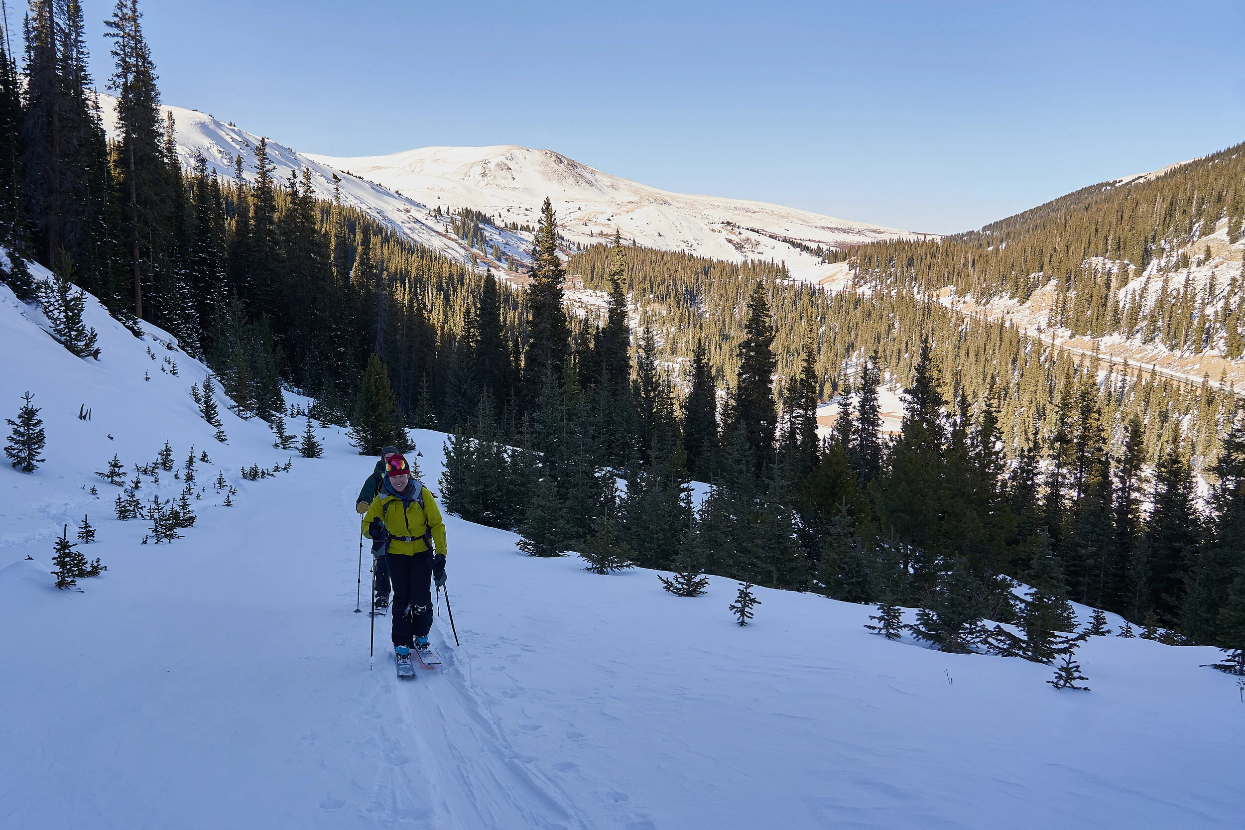 Skinning up the old cat track. The base area and Guanella Pass in the background.